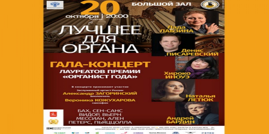 На галина-выступлении в Великом зале Столичной казенной консерватории выступят победители премии Лада Лабзина, Денис Писаревский, Хироко Иноуэ, Наталья Летюк и Андрей Бардин. На сцену также выйдут справедливый артист России Александр Загоринский (инструмент) и Вероника Кожухарова (инструмент). Прозвучат наилучшие произведения для органа – мелодические шедевры И.С.Баха, Ш.-М.Видора, Камиля Сен-Санса, Луи Вьерна, Ж.А.Алена, Оливье Мессиана, Флора Петерса и Астора Пьяццоллы.