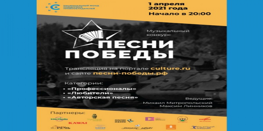 Интернет-перевод седьмого полуфинального выступления конкурса «Песни Победы», созданного Нац. фондом содействия правообладателей (НФПП), осуществится 1 апреля 2021 года. Созерцатели услышат две бардовские песни в выполнении Карины Габриэлян и Ивана Ялынского, а также выступление вокалиста-любителя Дмитрия Родионова.