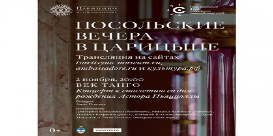 Интернет-перевод очередного события в рамках проекта “Посольские повечера в Царицыно” осуществится 2 ноября 2021 года. На этот раз вечор посвящен Аргентине, а культуру данной стороны никак нельзя отрекомендовать без танец. Концерт в Царицыне так и именуется – “Век танец”. Он подогнан к 100-летию со дня рождения композитора Астора Пьяццоллы и организован Музеем-заповедником “Царицыно” сообща с Государственным фондом помощи правообладателей при содействию Посольства Аргентины в России и лично чрезмерного и уполномоченного посла Аргентины в Русской Федерации Эдуардо Антонио Зуайна.